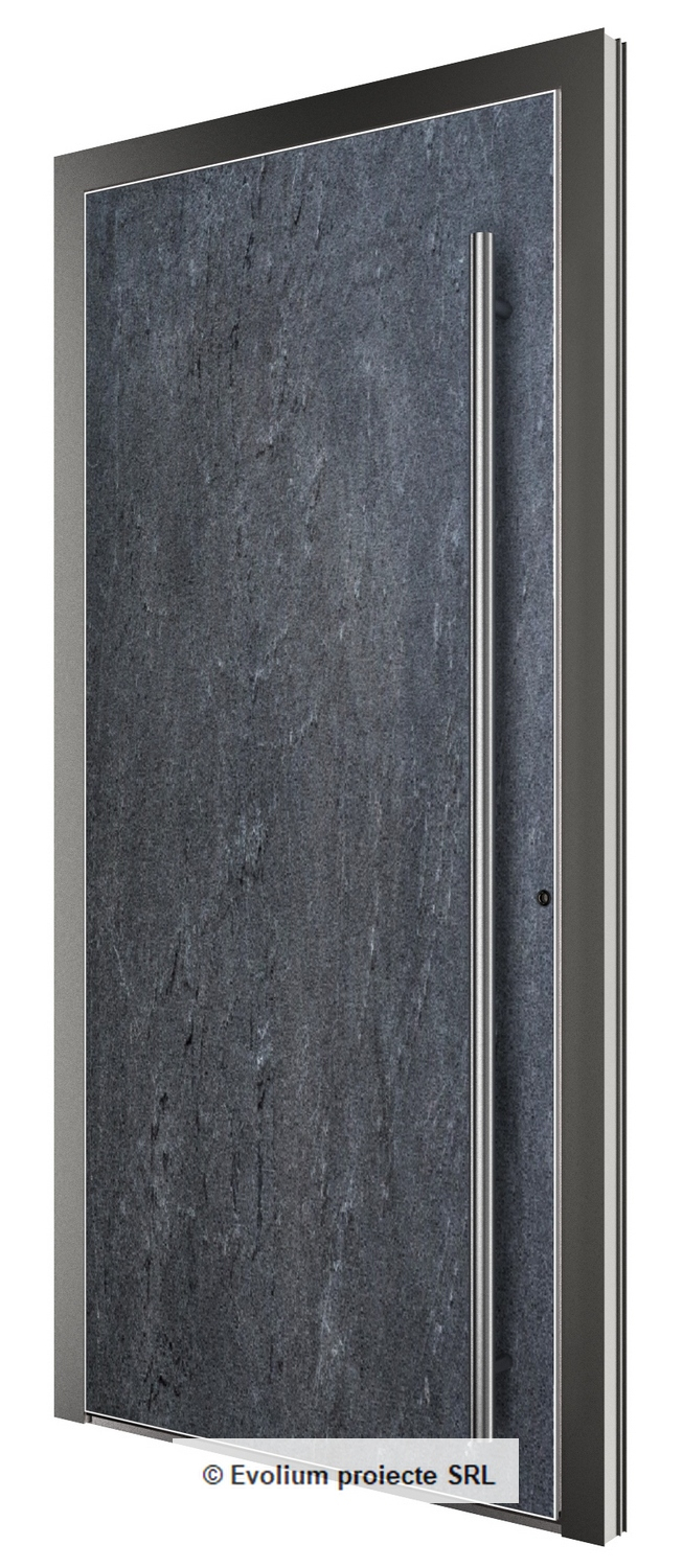 Usa este realizata din profile izolate din aluminiu pe care se lipesc foile de usa, realizate din tabla de aluminiu de 3mm vopsit in camp electrostatic culoare aspect beton sau rugină la exterior si tablă de aluminiu de 2.0 mm la interior, vopsita in camp electrostatic culoare RAL. Sistemul constructiv, cu o adancime de 80 mm, face ca fetele usilor sa se gaseasca in acelasi plan cu fetele tocului, contribuind la realizarea unui aspect elegant si precis.